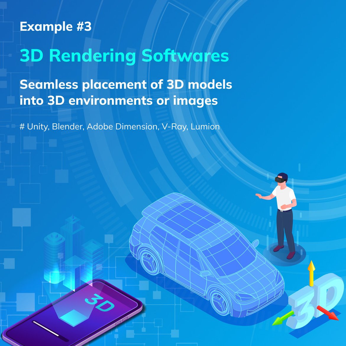 Some of the examples are Unity, Blender, Adobe Dimension, V-Ray, Lumion and many more.